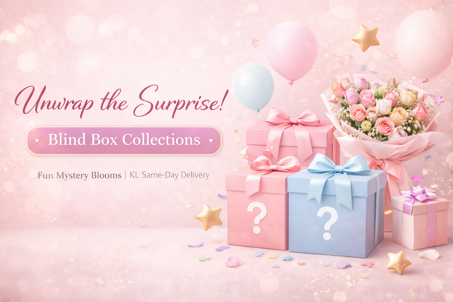 Discover the excitement of our Blind Box Flower Collection by One Florist Kuchai. Each mystery bouquet is uniquely designed with fresh flowers, making every order a surprise. Perfect for birthdays, celebrations, or spontaneous gifts. Same-day flower delivery available in Kuala Lumpur, Kuchai Lama, and Klang Valley.